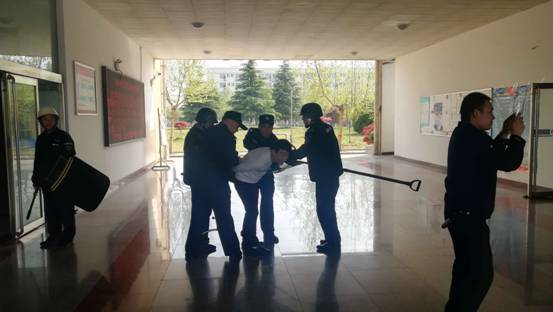 演练中我校模拟两名暴恐分子进入校园实施恐怖行为,威胁到200名师生的人身安全。保卫处接到报案后,迅速向属地派出所报警,派出所5名干警5分钟后到校与保卫处职员共同对暴恐分子进行了缉拿,解除了暴恐分子对师生人身安全的威胁。