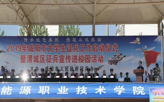 4月18日,“传承红色基因 携笔从戎报国”2019年咸阳市大学生征兵工作启动仪式暨渭城区征兵宣传进校园活动在陕西能源职业技术学院举行。