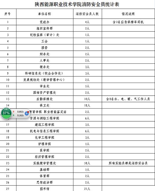 按照《陕西能源职业技术学院消防安全管理规定》的要求,二级单位书记(处长)为本单位消防安全责任人,分管消防安全工作的领导是本单位消防安全管理人,各单位还需有确定的消防安全专职或兼职管理人员负责具体消防安全事务。请各二级单位确定自己部门的消防安全员,并于11月15日17:00前将消防安全员姓名、QQ号电子版报保卫处吴双(QQ: 1420113701)处。各单位所需安全员人数如下图所示。