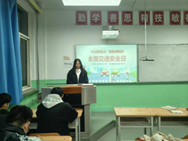 各学院以班级为单位,利用晚自习时间,举办交通安全教育主题班会,宣讲交通安全法律法规,普及交通安全自护知识,宣传现代文明交通理念,鼓励学生积极倡导和传播文明交通出行的理念。