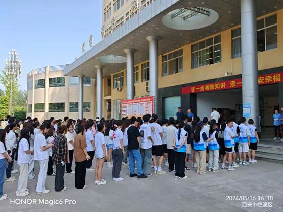 为了提高学生和教职工的消防安全意识,增强应急疏散能力,5月16日我校在临潼校区组织开展了消防应急疏散演练,保卫处、后勤保障处工作人员,各二级学院学工办主任、辅导员、班主任、学生,公寓值班人员参加了演练。