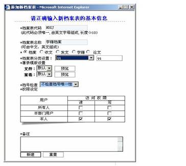 7. 权限设定:用户可根据自身实际情况设定不同的访问者对所建档案表的访问权限。图中对“所有人”、“本部门用户”、“本人”的访问权限分别默认作了设定。这里以及下文所使用的“用户”与“人”均指登陆本系统时的具体帐号,每个帐号都归属某个具体的“部门”,都有相应的可以控制的权限。属于部门档案馆的系统管理员(帐号:dba)为默认的唯一的有最高权限用户。用户与部门的创建与设置参看“系统设置管理”中的“用户管理”、“部门管理”。