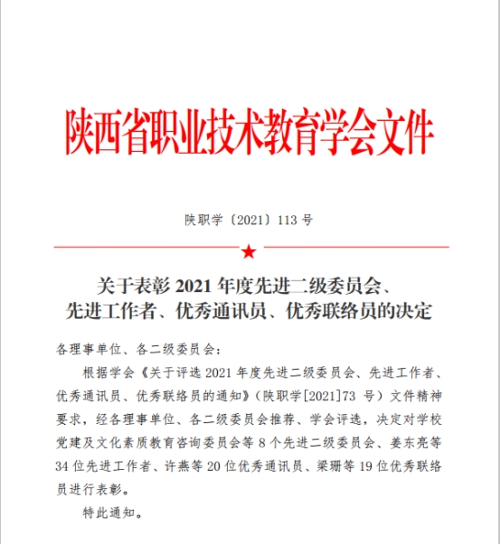 11月22日,陕西省职业技术教育学会发布《关于表彰2021年度先进二级委员会、先进工作者、优秀通讯员、优秀联络员的决定》(陕职学﹝2021﹞113号)文件,我校党政办宋溪玺、宣传部胡馨文分别获“优秀联络员”、“优秀信息员”荣誉称号。