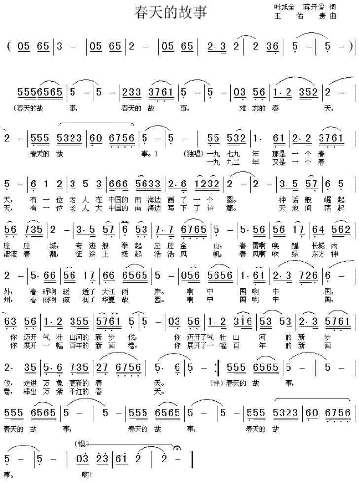 歌曲创作背景:《春天的故事》是由蒋开儒、叶旭全填词,王佑贵作曲的歌曲。1992年,该曲词作者蒋开儒在报纸上看到了长篇通讯《东方风来满眼春》,文中报道了深圳飞速发展的景象,蒋开儒因此希望能够实地看一下深圳,便只身前往了深圳。到达深圳的蒋开儒被眼前的景象所感染,从而决定留在深圳,并在深圳一个企业家艺术团谋得了一份工作,在这期间他有感而发,创作了该曲,成稿在1992年12月16日的早上。因为蒋开儒个人身世的背景,以及他对于邓小平的亲切、尊敬和感激之情,他在歌词中将邓小平称为“一位老人”,而因为蒋开儒初到深圳时,深圳是用铁丝网圈起来的,他便将开创深圳特区描绘为“画了一个圈”。
