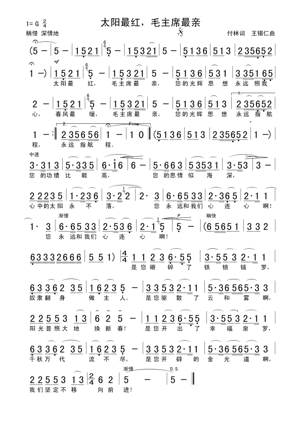 歌曲创作背景:1976年9月9日,毛泽东主席逝世,全国人民沉浸在一片悲痛之中。出于对伟大领袖的怀念和崇敬之情,付林写下了《太阳最红,毛主席最亲》这首词,然后将歌词交给了曲作者王锡仁。由于唐山大地震刚发生不久,很多人当时还住在地震棚里。王锡仁却手捧着付林写的歌词,走出了没有电灯的地震棚,冒着余震的危险,来到了空无一人的大楼里谱曲,他打开电灯、铺开稿纸,旋律随着眼泪流淌,音符伴着激情跳荡……第二天早晨,他走出大楼,迎着满天朝霞,向人们捧出了《太阳最红,毛主席最亲》动人旋律。这首歌的词曲创作只用了不到一周的时间。