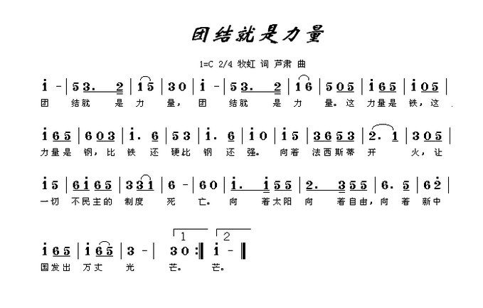 歌曲创作背景:《团结就是力量》由牧虹作词、卢肃作曲,产生在1943年6月晋察冀边区平山县黄泥区的一个小村子。为了反对日寇到边区抢粮,实行“抢光、杀光、烧光”的疯狂政策,西北战地服务团深入到河北平山和山西繁峙的广大农村参加斗争。为了配合这场斗争,牧虹和卢肃同志一起在三四天左右时间里,突击创作了小型歌剧《团结就是力量》。在这个剧的排练过程中,大家觉得剧情还可以,就是感到结束得有些突然,缺乏终止感。综合大家建议,决定由牧虹同志写词,卢肃同志谱曲,为该剧增加一个幕终曲,于是《团结就是力量》这首经典名曲,就这样诞生了。