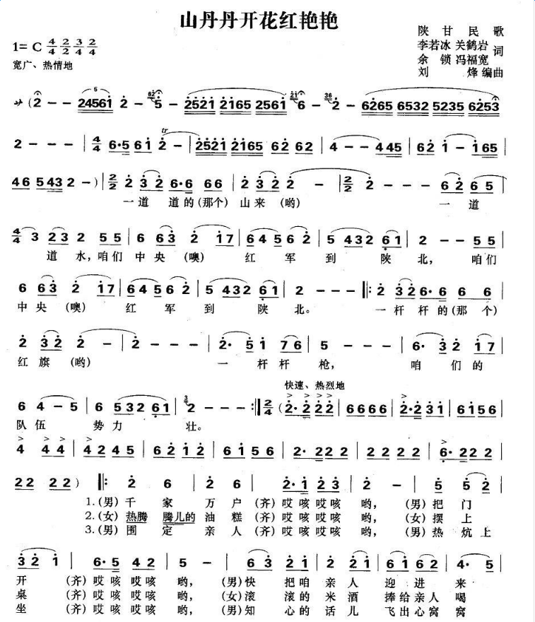 《山丹丹花开红艳艳》是一首陕北民歌,是劳动人民集体创作,是一首民族风味较浓的陕北信天游。全曲曲调明亮,旋律优美。描述红军长征胜利抵达陕北时,正逢满山的山丹丹花开的美丽情景。