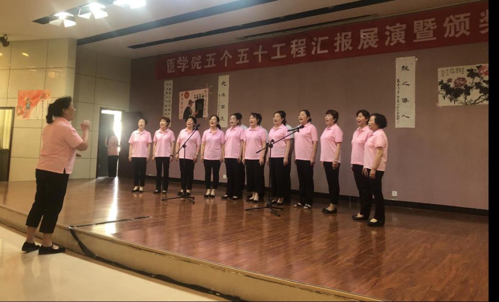 医学院学工办特别邀请彩虹老年大学的银杏树合唱团激情表演了大合唱《珊瑚颂》《洪湖水浪打浪》,拉开活动展演的序幕。医学院学工办将本学年举办的系列比赛活动的优秀节目逐一展演,有诗歌朗诵《红色信仰》《为祖国而歌》,大合唱《国家》《精忠报国》《我的中国心》《九儿》,歌伴舞《绒花》,舞蹈《沂蒙山》,舞台剧《送别》等。这些由个人、班级及入党积极分子带来的节目,展现了革命时期革命者抛头颅洒热血的革命情怀,让在场的同学和老师潸然泪下。汇报展演活动在全场人员合唱《我和我的祖国》中拉下帷幕。