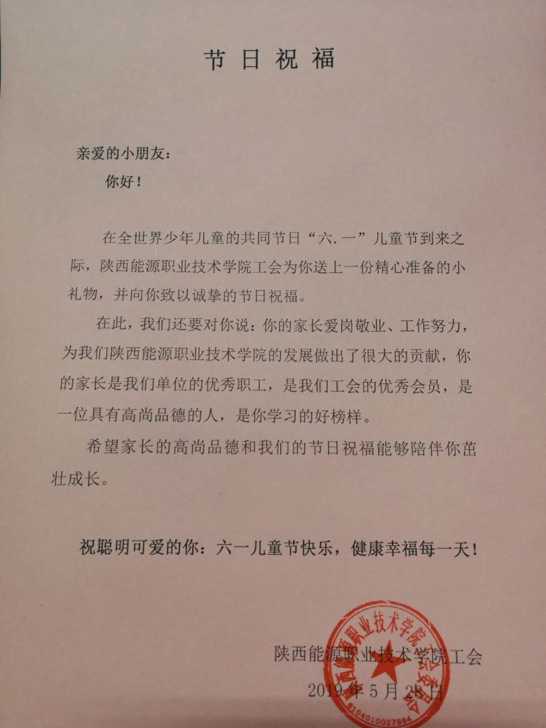 在“六.一”国际儿童节到来之际,为了营造我校爱护儿童、关心儿童的氛围,使我校职工的少年儿童过上一个有意义、快乐祥和的节日,校工会于5月30日在全校范围内为我校职工家的少年儿童送上了一份精美的小礼物,为和谐美丽的校园增添了一份欢乐。