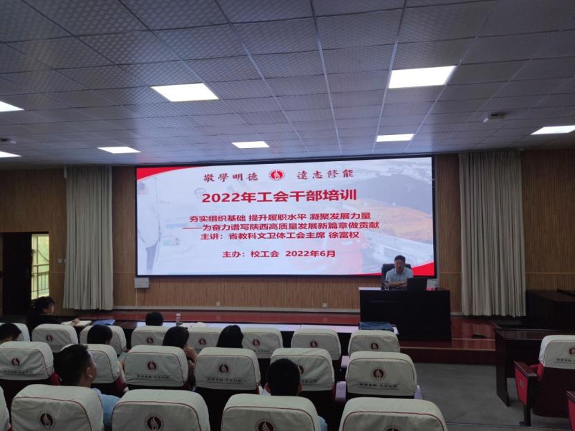 6月22日下午,在办公楼文林大讲堂,校工会举办2022年工会干部培训班第二次专题报告,邀请陕西省教科文卫体工会主席徐富权同志作专题讲座,校工会委员及专兼职干部、各基层工会主席和委员参加培训,党委委员 工会主席杨笑琪同志主持。