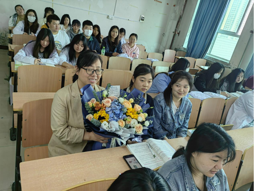 分会主席韩晓磊(右一)代表学院向护士李延莉(右一)老师献花