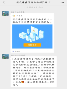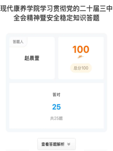 为学习贯彻党的二十届三中全会精神,全面深入把握全会精神,坚持以教育家精神为指引,提升高校教师育人本领,同时,结合学校近期工作安排,认真学习落实学校党委关于近阶段安全稳定工作的会议精神内容,抓实抓细校园安全稳定工作,防范遏制校园安全事故发生,现代康养学院工会于2024年11月24日至12月4日开展了学习贯彻党的二十届三中全会精神暨安全稳定知识答题活动,全院教职工积极参与。