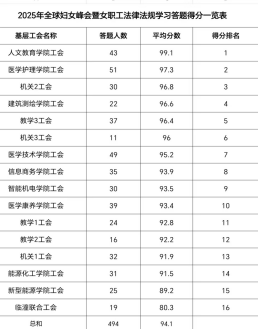 为深入贯彻习近平法治思想,落实妇女权益保障相关工作要求,切实提升女职工法律素养,结合我校2025年女工工作计划,在全球妇女峰会闭幕之际,校工会及女工委员会联合举办了全球妇女峰会习近平主席讲话精神暨妇女权益保护法规知识答题活动,现圆满结束。活动以线下答题形式开展,全校女职工494人参与,答题参与率达98%,平均得分94.1分。活动在全校女职工中掀起了学讲话、会用法的热潮。