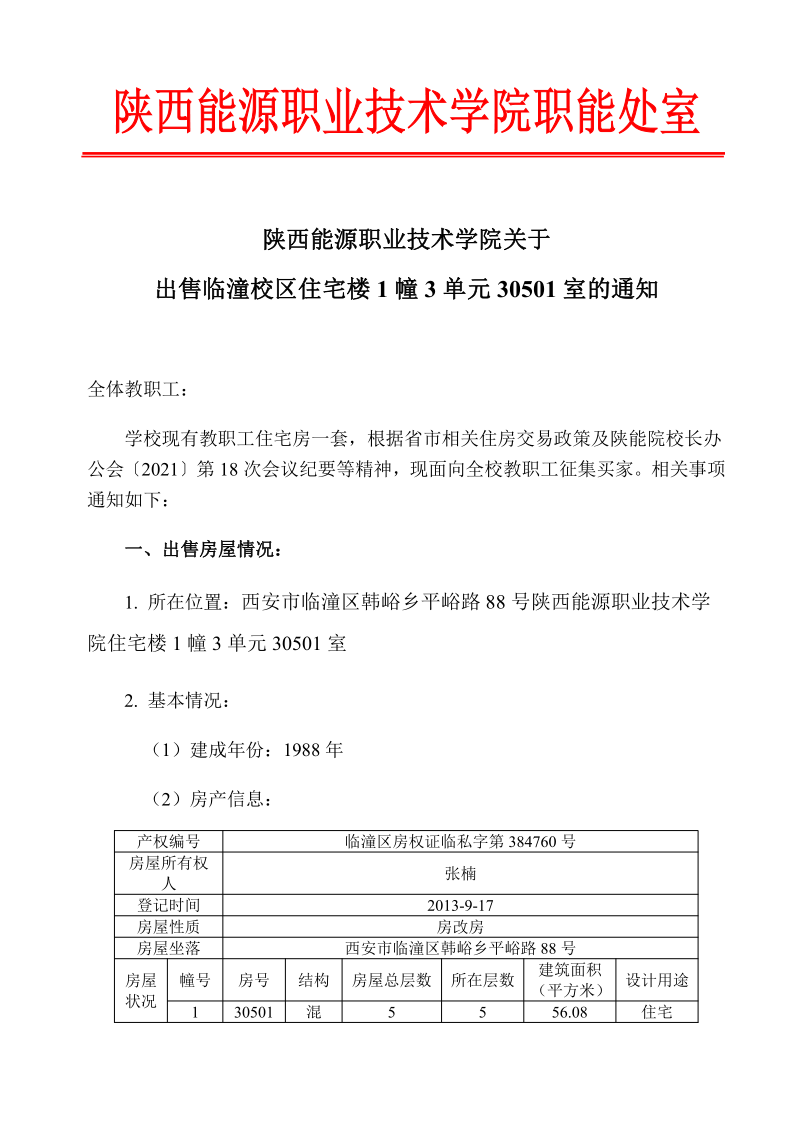 关于出售临潼校区住宅楼1幢3单元30501室的通知