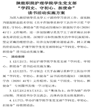 根据陕西能源职业技术学院《关于在辅导员和学工队伍中开展“学四史、守初心、担使命”读书活动的通知》(陕能院学办〔2020〕41号)文件精神,护理学院学工党支部制定了《“学四史、守初心、担使命”读书活动实施方案》。2020年12月21日-2021年1月8日,学工党支部组织开展了“学四史、守初心、担使命”系列专题读书活动。