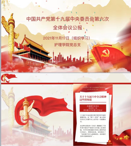 11月8日至11日,中国共产党第十九届中央委员会第六次全体会议在北京召开。全会审议通过了《中共中央关于党的百年奋斗重大成就和历史经验的决议》,全会公报发布后,迅速在护理学院全体师生中引起热烈反响,掀起学习热潮。