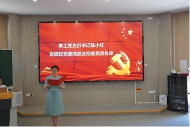 入党宣誓仪式在庄严雄壮的《国际歌》歌声中拉开帷幕。学工党支部书记陈小红同志宣读校党委批复及预备党员名单,王瑜同志及陈小红同志为预备党员代表发放党徽及学习笔记本。