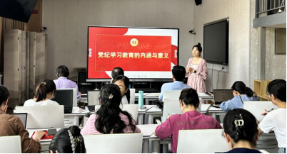 6月5日,护理学院教工党支部书记张扬以“党纪学习教育是什么?学什么?怎么学?”为主题,在教师发展中心为护理学院教工党支部全体党员讲授党纪学习教育专题党课,全体党员教师积极参加。