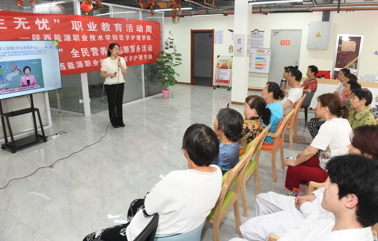 根据《关于做好陕西能源职业技术学院2025年职业教育活动周相关工作的通知》,为响应“健康中国2030”规划纲要号召,传播科学营养知识,推进体重管理年“三年行动”,倡导科学、文明、健康的生活方式。5月15日,医学护理学院营养专业师生代表及智慧健康养老与管理专业学生代表一行30人前往自强路街道向荣社区,开展2025年“职教周”及“全民营养周”主题志愿服务。活动以“全民行动,科学减脂,拥抱健康生活”为主题。自强路街道党工委副书记、组织委员、宣传委员王晟、向荣社区负责人王红彦等参与及主持,向荣社区中医理疗师、居民共同参加活动。活动在社区活动中心开展,将职业教育实践与健康科普相结合,通过八段锦养生操、专家讲座、趣味科普、小品表演、健康咨询、营养义诊、减脂茶及中药香囊制作等形式,将体重管理及健康生活理念送入千家万户,受到社区群众热烈欢迎。