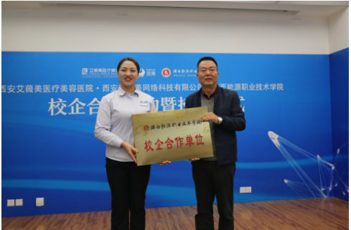 陕西能源职业技术学院科研处处长闫光准代表学校授予西安艾薇美医疗美容医院为校企合作单位,艾薇美第三片区人事总监卞鹤接牌。
