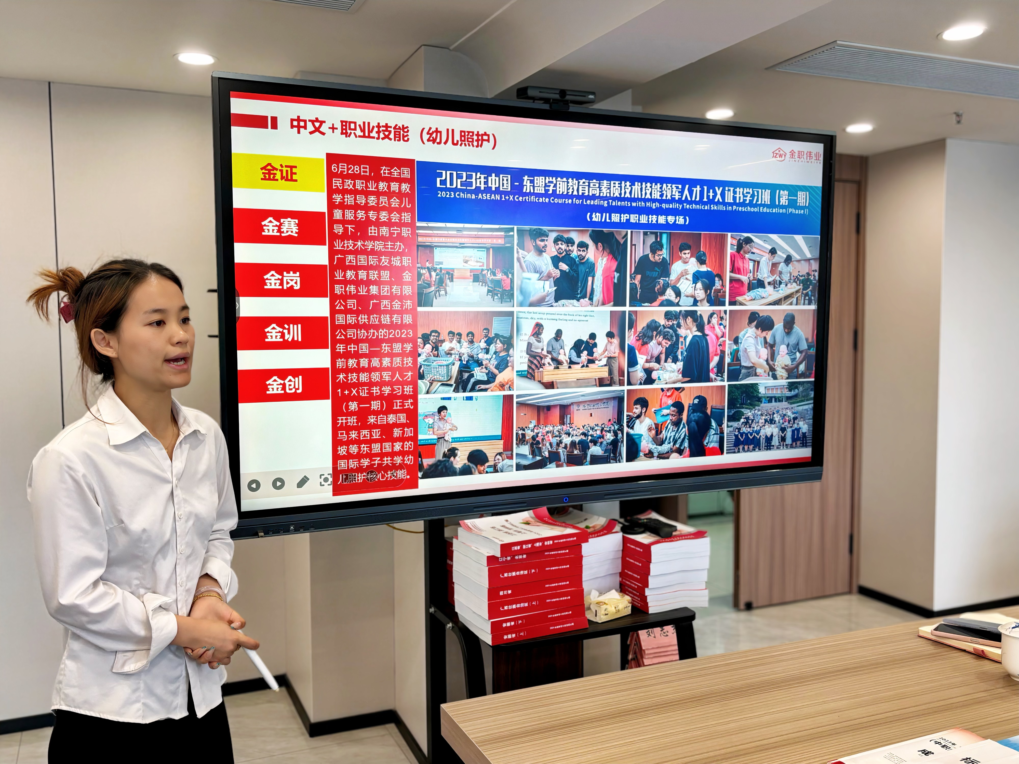 龙桂平以“产教协同 四链融合 十金赋能——金职伟业家庭服务领域创新实践”为主题,通过赋能家庭服务的教育链和人才链、产业链和创新链等模块,系统介绍了公司发展历程、核心业务布局及产教融合典型案例等,重点分享了企业在家庭服务标准化建设、职业技能认证、教育教学成果、产品研发等领域的成果。