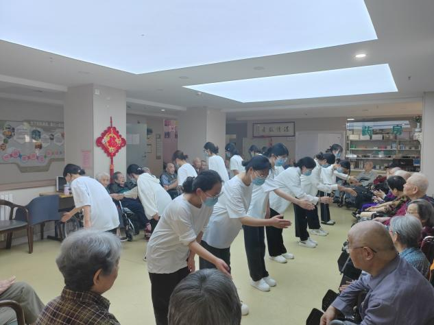 活动的最后,同学们来到一楼与老人们传气球、打篮球,一起互动,她们用青春活力与专业素养,为老人带来了精心准备的礼仪操和五禽戏,现场欢声笑语不断。