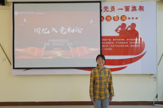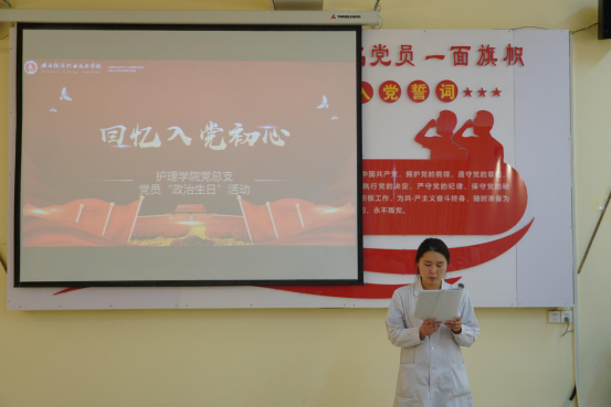 活动由护理学院党总支组织委员陈小红主持。活动开始,护理学院党总支书记王瑜为17名党员送上赠言:“一个党员的政治生命属于党,记住它是对党的忠诚和信仰,纪念它是我们每一名党员对党的感激和感谢。今天在这里举办党员‘政治生日’专题组织生活会,目的是让党员重新回忆党组织的培养历程,强化党员宗旨意识,提醒党员始终牢记入党时的铮铮誓言,激发党员的工作热情和无私奉献的精神。”