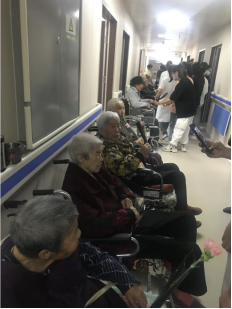 在每个楼层献花慰问的过程中,周彩云院长为学生介绍第三爱心护理院的管理制度、日程生活护理情况、老人照护过程中的安全问题以及与不同状态下老人沟通的方法及技巧。学生们主动与老人沟通,在参观学习中感受养老护理院的工作现状及老人日常生活护理情况。大家纷纷表示感受颇深,收益匪浅。