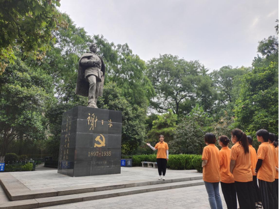 西安革命公园始建于1927年,全国重点文物保护单位、“党史教育基地”和“西安市青少年爱国主义教育基地”,园中修建有陕北革命根据地的建立者谢子长和刘志丹的雕塑,著名爱国将领杨虎城将军的铜像,以及为纪念北伐战争前夕坚守西安死难军民的建筑和雕像等。在谢子长和刘志丹的雕塑前,团队成员带领调研团学习两位烈士的生平事迹,了解他们为革命战斗牺牲的故事。