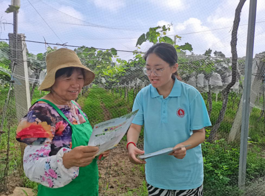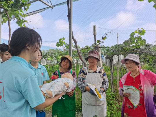 随后,陈传根带领实践队成员参观了农场,了解到成蹊农场的葡萄已经发展为20多个品种,成员们在参观的过程中参与葡萄的剪枝工作,学习到葡萄在种植过程中需要注意的各类事项,也为农场工作人员进行了夏季防暑知识及气道异物急救--海姆立克急救术的科普,并发放卫生健康小知识宣传彩页及防疫防暑物品。