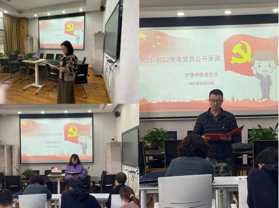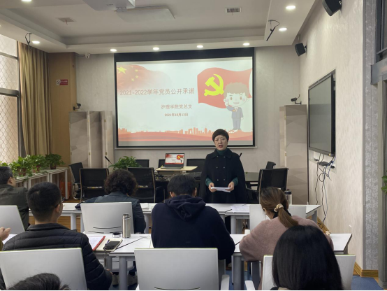 2021年10月13日下午,护理学院党总支组织全体党员在教师发展中心开展2021-2022学年党员公开承诺活动,党员教师通过认真学习《中共陕西能源职业技术学院委员会关于开展2021-2022学年度党员公开承诺的通知》(陕能院党【2021】98号)文件精神,结合自身的岗位工作和职责,对加强自身建设、履行岗位职责、廉洁自律等方面,完成定诺。教工党支部与学工党支部三位教师党员代表分别进行公开承诺,通过公开承诺增强党员责任意识,发挥党员干部先锋模范作用和党组织战斗堡垒作用。