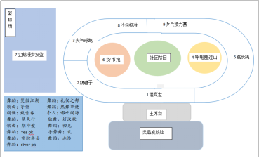本次运动会将运动性与趣味性相结合,设置了趣味运动、社团表演、初恋棉花糖三大类。其中趣味运动包含坦克走、踢毽子、夹气球跑、呼啦圈过山车、跳长绳、企鹅漫步投篮、沙包投准、乒乓球接力赛、猜灯谜十个项目,着重鼓励学生合作参与,培养团队合作精神。比赛获胜的同学赢得奖劵,兑换了各种喜爱的小礼物。参与师生们的加油呐喊、欢声笑语充满了午后阳光下的操场。