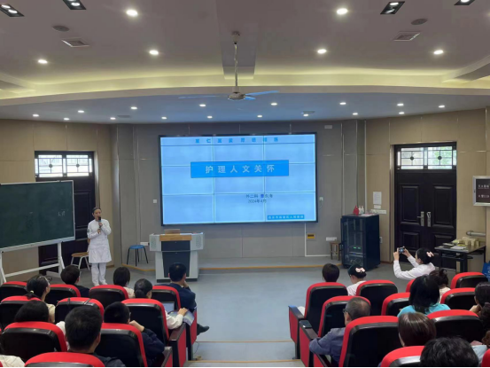 随后,徐利与曹东海分别以“护生角色转变”“护理人文关怀”为主题进行宣讲。徐利结合自身工作经历从角色的概念、护士的角色、角色的转变、角色转化的方法及职业生涯规划等五个方面生动讲述了如何才能更好地实现护士角色转变,在工作中赢得病人、同事、领导的尊重。