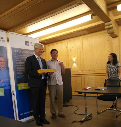研修团成员参加双元制职业教育培训结业典礼,由德国爱科特教育集团董事长策莫曼先生为所有成员颁发德国工商行会IHK认证的国际专业培训师证书。同时,赵龙波副院长代表学校赠送礼品,表示德国教育理念先进、教学质量优良,愿双方以后能够更多地深入交流和学习。