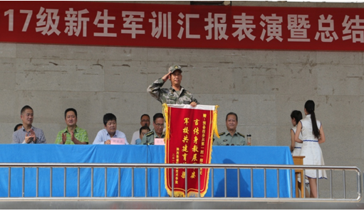 党委副书记、军训工作领导小组组长郭开龙做总结讲话。郭书记对两周以来辛勤执教的教官和参与军训工作的老师表示诚挚的感谢,对同学们取得的良好军训成果表示衷心的祝贺。受训同学自觉按照军训要求,坚韧不拔、顽强拼搏,经受住了严格、艰苦的队列训练,在宿舍内务整理、团结协作等方面均取得了长足的进步,这是同学们进入大学阶段所交出的第一份满意的答卷。希望所有新生在今后的学习和生活中继续保持在军训中养成的坚韧果敢、服从命令、雷厉风行的作风,尽快熟悉老师、熟悉同学、熟悉环境,调整好心理状态,迈好大学生活的第一步。同时希望同学们要重视良好思想品德的塑造,并将其转化为社会公德,行为习惯,争做品学兼优的合格大学生。愿大家珍惜大学时代的美好时光,努力提高学习能力,争取成为社会主义事业的合格建设者。