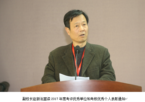 在2018年工作会上,副校长赵新法宣读了《关于表彰2017年度考评优秀单位和优秀个人的通知》,校领导为各考评优秀单位颁发奖牌。