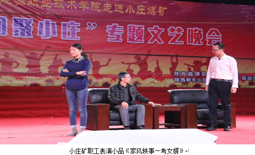 10月13日,我院“优秀校园文化进矿山”系列活动之——“情系矿山•团聚小庄”专题文艺晚会,在陕西彬长小庄矿业有限公司举行。学院党委副书记郭开龙、团委书记于涛;陕西彬长小庄矿业有限公司党委副书记、执行董事、总经理陈跟马,党委书记杨玉成,党委副书记、工会主席、副总经理郭俊生,纪委书记景志义,副总经理贺彦文、董红涛;以及陕能院学生代表、小庄矿职工代表等500多人共同观看晚会。