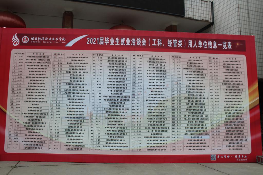 陕西煤业化工建设(集团)有限公司、陕西延长石油矿业有限责任公司、新疆焦煤集团、陕煤榆北煤业有限公司、关中地区各矿务局、彬县煤炭有限责任公司、金诚信矿业管理股份有限公司、宝钢集团新疆八一钢铁有限公司、中国能源建设集团天津电力建设有限公司、杭州海康威视电子有限公司、京东方科技股份有限公司等大型中、省、地方国有企业及多家上市公司参与招聘。