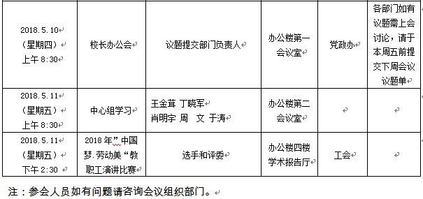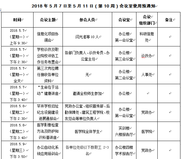 2018年5月7日至5月11日(第10周)会议安排预通知