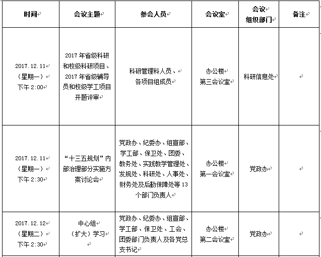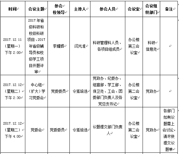 2017年12月11日至12月15日(第 16周)会议安排预通知