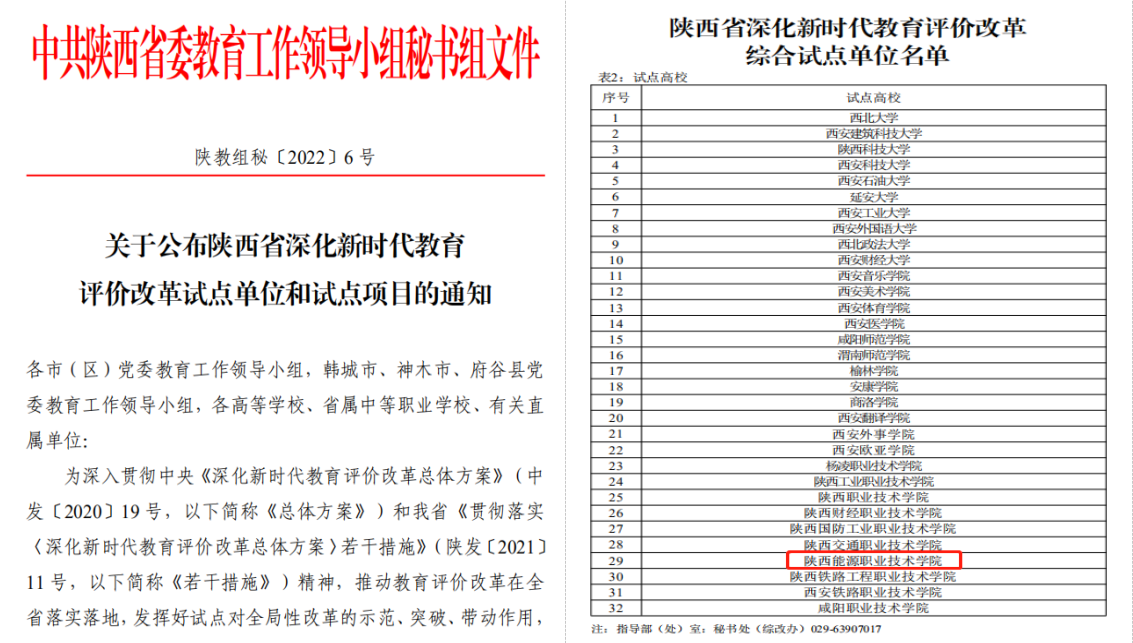 近日,中共陕西省委教育工作领导小组秘书组《关于公布陕西省深化新时代教育评价改革试点单位和试点项目的通知》(陕教组秘〔2022〕6号)公布,我校成功入选陕西省深化新时代教育评价改革综合试点单位。