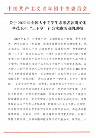 近日,共青团中央发文对2022年全国暑期“三下乡”社会实践活动进行总结表彰,通报表扬一批表现突出的优秀集体和个人,我校团委书记冯超被评为2022年全国暑期“三下乡”社会实践“优秀个人”。