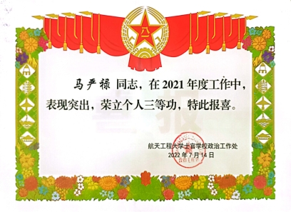 我校现役军人大学生马严禄,2017级入学,2018年参军入伍,入伍以来不忘初心、牢记使命,争做“四有”革命军人,始终铭记家乡人民的嘱托,扎根军营、无私奉献,受到部队多次表彰奖励,展现出当代大学生的精神风采和使命担当,在部队中工作表现突出,荣立个人三等功。