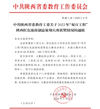近日,由中共陕西省委教育工委发文,对2022年“双百工程”陕西红色旅游创意策划大赛的优秀团队和个人进行表彰通报。我校首次参赛并荣获5项省级荣誉。