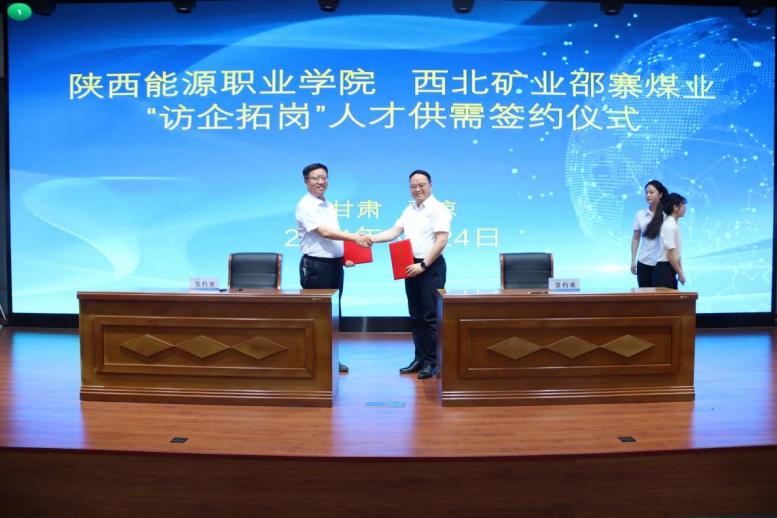 座谈会上,朱忠军与西北矿业邵寨煤业公司党委书记、董事长刘延生签订了“访企拓岗”协议,并与李新共同为实习就业一体化基地揭牌。