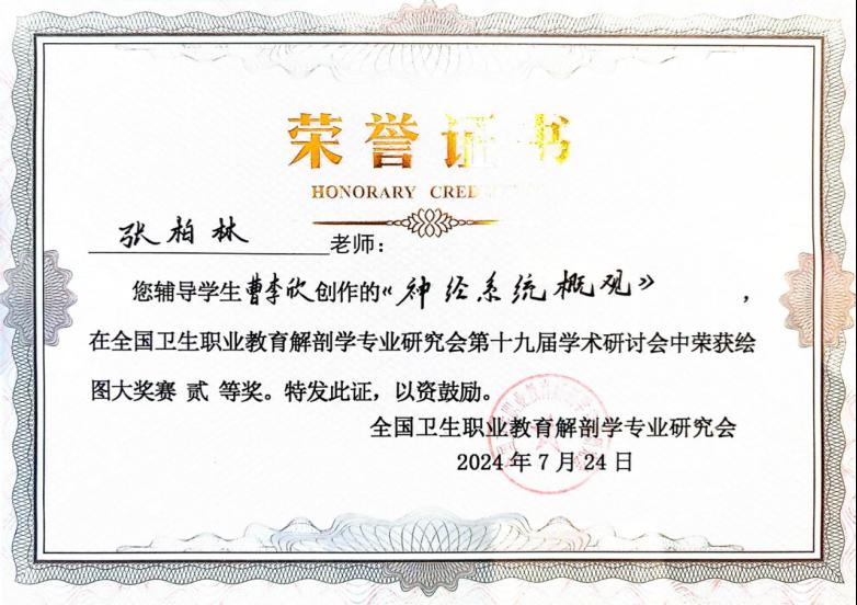 年会期间举行了“解剖学学生绘图比赛”优秀解剖学绘图作品评选,全国共有46所院校参加本次比赛,参赛作品多达230余幅,经过评委严格的评选,我校共4幅解剖绘图作品获奖。由殷朋宜老师指导,宣丹阳同学创作的作品《解密躯干肌》获得由全国卫生职业教育解剖学专业研究会及第十九届学术研讨会颁发的二等奖。由张柏林老师指导,曹李欣同学创作的作品《神经系统概观》、郝崇雅同学创作的作品《生命之秘》获得由全国卫生职业教育解剖学专业研究会及第十九届学术研讨会颁发的二等奖及三等奖。由高春妮老师指导,刘冰盈同学创作的作品《胸腹腔》获得由全国卫生职业教育解剖学专业研究会及第十九届学术研讨会颁发的三等奖。这也是我校作品首次在该赛事中获奖。