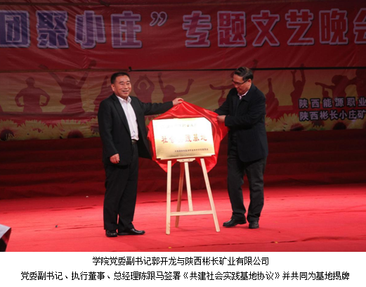 晚会期间,隆重举行了学院与陕西彬长小庄矿业有限公司共建“大学生社会实践基地”的签字与揭牌仪式。近年来,学院坚持文化育人和实践育人相结合的培养模式,注重在实践中锻炼和培养学生的综合素养。近两年,学院在社会实践工作方面荣获省级以上荣誉23项。今年7月,学院暑期社会实践“追寻校友足迹 启迪成功人生”寻访校友实践团在小庄矿业公司开展了实践活动,取得良好效果。学院与小庄矿建立了深厚情缘,尤其在当前校企合作持续深入背景下,双方决定共建社会实践基地,共同发展。学院党委副书记郭开龙,陕西彬长矿业有限公司党委副书记、执行董事、总经理陈跟马在主席台上签署了《共建社会实践基地协议》,并共同为基地揭牌。