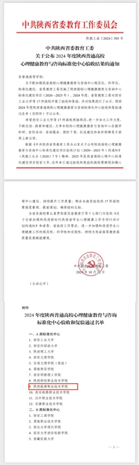 近日,中共陕西省委教育工委公布了2024年度陕西普通高校心理健康教育与咨询标准化中心验收结果,我校心理健康教育中心以94分的优异成绩通过陕西省普通高校标准化中心定级(A类)验收,获评“陕西普通高校心理健康教育与咨询A类标准化中心”。