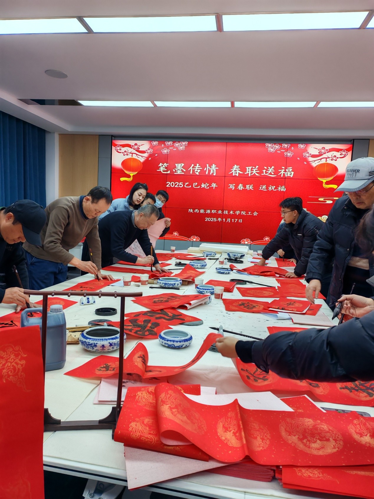 书法爱好者们齐聚一堂,挥毫泼墨,将美好的祝愿凝聚于笔端。老师们积极参与,有的认真思考、撰写、挑选春联内容,有的则亲手尝试书写,体验翰墨书香的独特韵味。活动现场热闹非凡,在音乐“春节序曲”的烘托下,处处洋溢着喜庆与和谐的气氛。一幅幅春联,红纸黑字,墨香四溢,散发着中华书法艺术的魅力,既有辞旧迎新的美好愿景,也饱含对职工蛇年的温馨祝福。