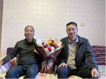 党委书记刘予东慰问退休教师翟聚仓(左)